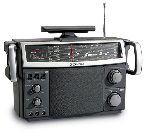 Stay in the know with this Emerson Multi-band Radio. Communication has never been more clear. It's loaded with all the extras so you'll stay in touch with the latest both here and abroad. Now hear this: Receives full fidelity AM / FM, all 40 CB channels, VHG marine band, VHF aircraft band, NOAA weather broadcasts, TV sound from VHF stations 2-13 plus foreign broadcasts from around the world; Built-in PA amplifier with microphone; 3-way LED meter for power, signal strength and battery level; Earphone jack with earbuds; Wide-range dynamic speaker; Operates on 120V AC power or 4 D batteries (not included); Built-in AC power cord with cord storage compartment; DC input jack for external car / boat adapter (adapter not included). UL-listed. Measures 15 x 6 x 10" h., 5 lbs., 9 ozs. Get tuned to the world... order ONLINE today! Emerson Multi-band Radio with Built-in PA