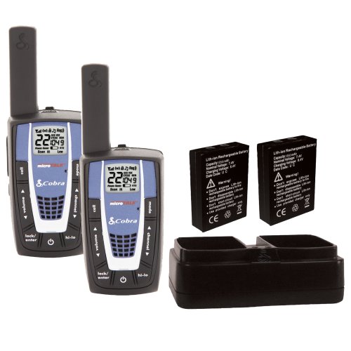 The Cobra CXR700 is a Micro TALK 2-way radio, two pack with up to a 25 mile range. This unit consists of 22 channels, 142privacy codes (38 CTCSS codes/ 104 DCS codes) and comes complete with 2 lithium ion battery packs, and a 2-port desktop mini-charger. This unit also features hands-free operation (VOX), VibrAlert silent paging, call alert (10 selectable tones), a backlit LCD display, a scanning function (channels/ privacy codes), a single pin speaker/ microphone/ charge jack, a 10 channel memory, selectable hi/low power in GMRS, key lock, roger beep (selectable on/off), key stroke tones (Selectable on/off) , a battery low indicator, battery/ power saver mode, signal strength meter, auto squelch, a maximum range extender, and a belt clip. This product comes in ROHS lead free, eco-friendly packaging.
