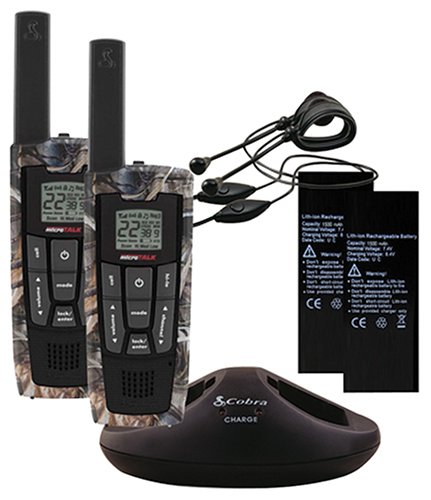MicroTalk? Realtree Max 4 camoflauge two-way Radio pack with up to 27 mile range. 22 channels, 121 privacy codes (38 CTCSS, 83 DCase codes). 2 rechargeable lithium ion Battery packs. 2-port desktop charger. 2 boom microphones. 10 channel NOAA radio. Handsfree operation (VOX). VibrAlert? silent paging. Backlit LCD display. 10 channel memory. Scan (channel/privacy code/memory). Selectable high/med/Low Power (in GMRS). Signal strength meter. Single pin combination speaker/microphone/charge jack. Call alert (10 selectable tones). Key lock. Roger beep (selectable on/off). Key stroke tones (selectable on/off). Battery Low indicator, battery/Power saver. Auto squelch. Maximium range extender. Belt clip.