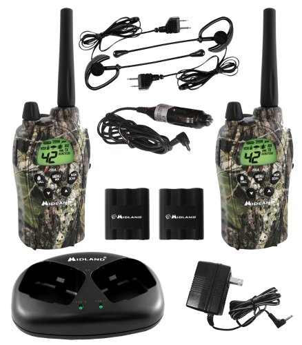 Midland GXT950VP4 5 Watt 42 Channel Waterproof Mossy Oak Break Out Camo GMRS Radios with NOAA Weather/All Hazard Alert. Includes Rechargeable Batteries, Dual Desktop Charger, Headsets, and 12 Volt Vehicle Adapter, Pair Packed. The GXT950VP4 features the standard 22 GMRS Channels and an extra 20 Channels. The GXT950 meets the JIS4 Standard of exposure to water for 30 minutes and features the Maximum Power allowed for GMRS Handheld Radios of 5 Watts, for up to a 30 Mile Range. The Weather Scan feature finds the nearest NOAA broadcast to stay up to date with the latest weather and hazard information. In addition to important weather announcements, All Hazards Alert means the GXT950VP4 will receive other emergency announcements such as Child Abduction (Amber Alert), Nuclear Power Plant warnings, Biological Hazard, Fire, and Landslide Warnings. The GXT950VP4 features Voice Scramble to add security to conversations and Direct Call which allows you to reach one person in your group without alerting the others. A Vibrating Alert for silent notification, 9 Level E Vox for Hands Free operation, 142 Privacy Codes, Scan of the 42 Channels, Hi/Med/Low Power Settings, 10 Call Alerts with an additional 5 Animal Call Alerts, Keypad Lock, and Battery Save Circuit. Unlike other GMRS radios on the market that use lithium batteries, Midland's Dual Power Option allows the use of the included rechargeable batteries or 4 "AA" batteries (Not included).